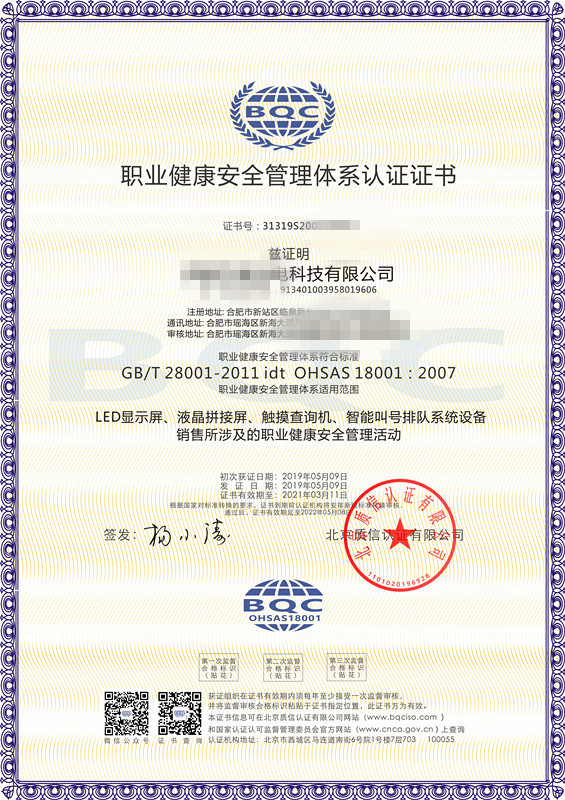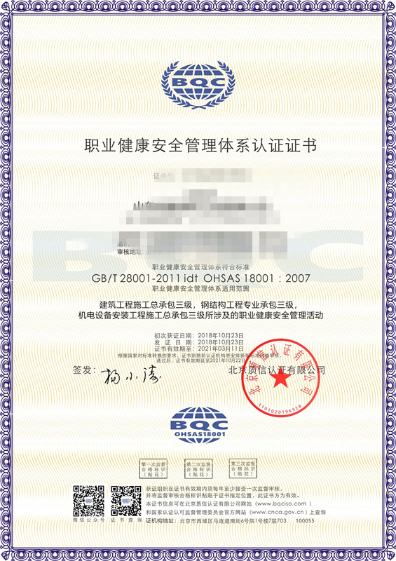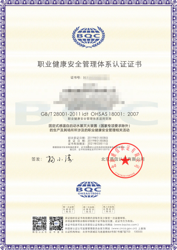 • 消防行業職業健康ISO認證證書