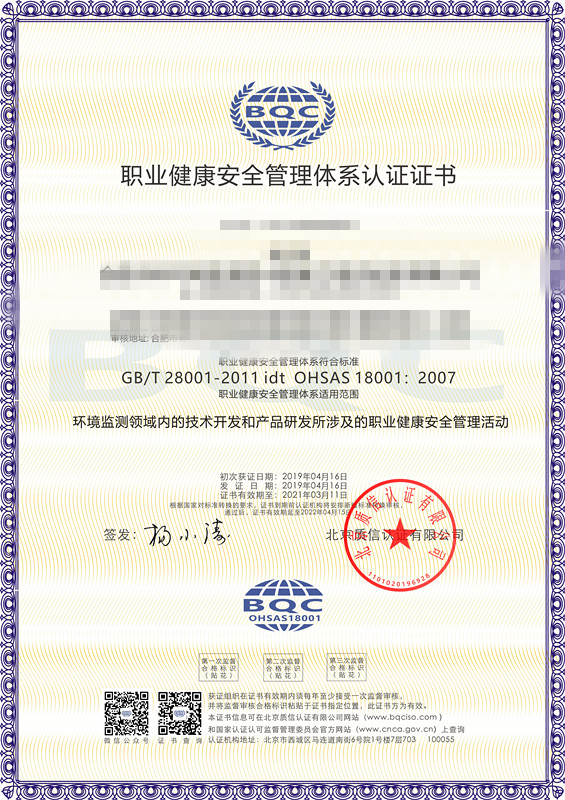 • 環境監測公司ISO三體系認證證書